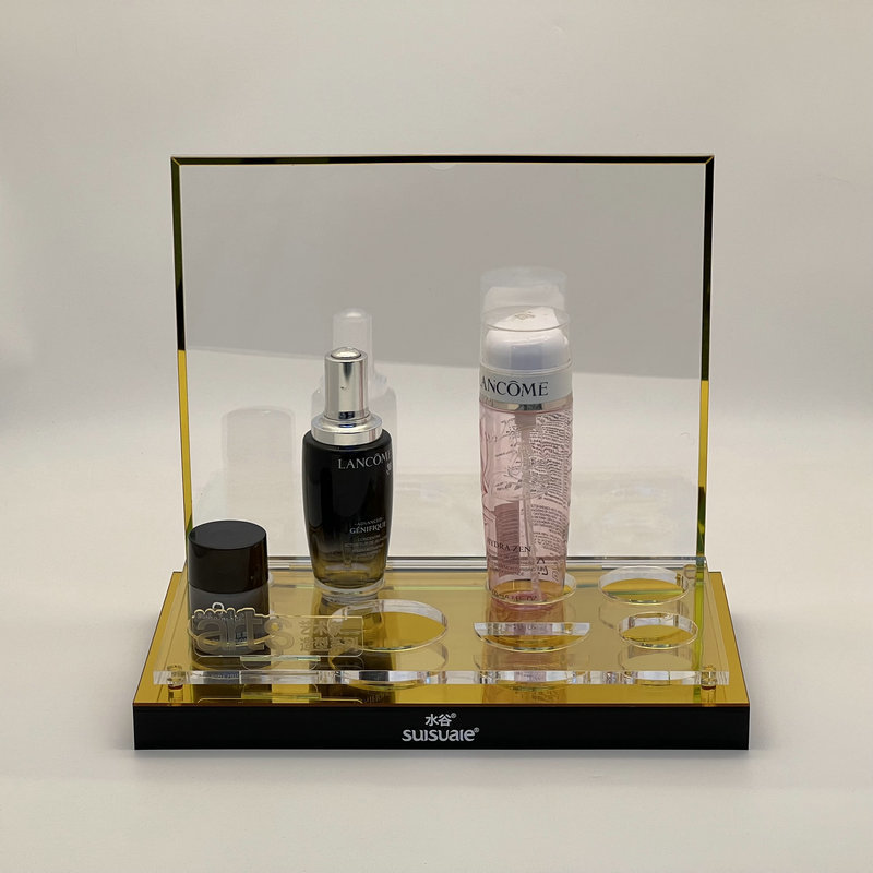 Showcase products in style with this premium acrylic cosmetic display. It features a luxe gold mirror base, a sleek black frame, and custom-fit slots to elegantly organize skincare and makeup. Ideal for retail counters and vanities. Available for wholesale.