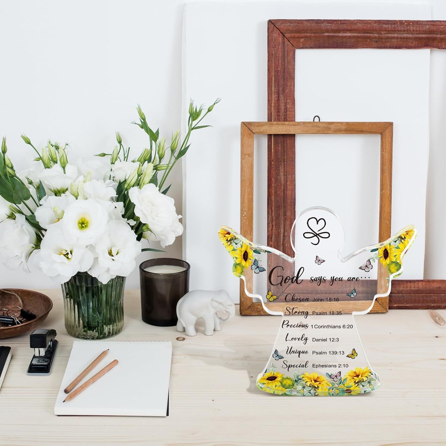 This sunflower-themed angel is a burst of spiritual sunlight, an optimal gift for baptisms, confirmations, college graduations, or for any good friend or relative that needs a suggestion of their real identification and worth in Christ.