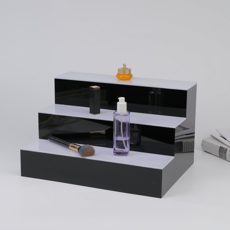 Showcase your products on this modern 3-tier acrylic ladder display. Its sleek black frame and contrasting white shelves provide a stylish, high-end look perfect for cosmetics, collectibles, and retail items. A durable and elegant organizer, direct from our factory.